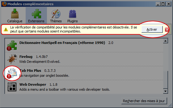 - et une alerte vous permet de réactiver la vérification de compatibilité ... quand vos extension auront été mises à jour par exemple.